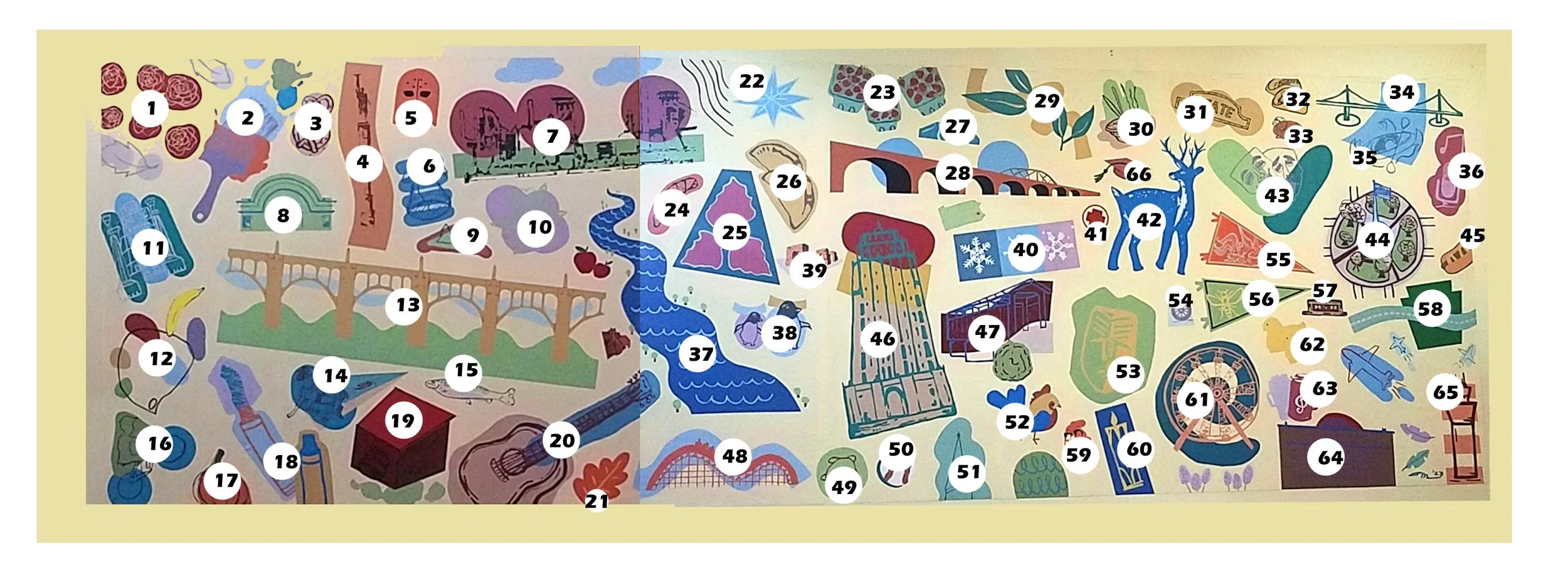 This mural entitled “Valley Wide” was made as a collaboration between muralist Matt Halm and over 40 students from Emmaus High School, in Emmaus, PA and Building 21 High School, in Allentown, PA. Over a two-month residency, students were introduced to and engaged in all aspects of mural-making including concept creation, visual research, image transferal, drawing, and painting. The mural was painted on flexible cloth panels which were permanently installed in this space. This beautiful and vibrant piece highlights the many landmarks, natural wonders, and culinary delights of the Lehigh Valley through student illustrations and vignettes.